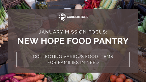 For our January Mission Focus, we're supporting New Hope Food Pantry located in Olathe, KS. Right now, they're in need of the below items. Mission bags are available in the church lobby. Fill a bag and place it in the mission bin anytime in January. Thank you for stocking their shelves for the new year!