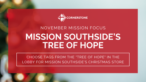For our November Mission Focus, we're collecting unwrapped Christmas presents for Mission Southside’s Tree of Hope! Choose the items you would like to donate from the Tree of Hope in the Lobby. These gifts will be used in Mission Southside’s Christmas Store where families in need can come to pick out gifts.